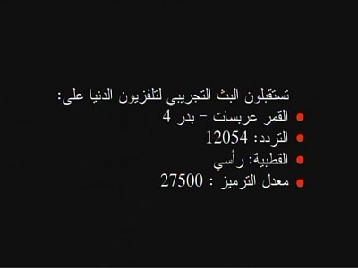 Новая передача началась DVB-S Открытый: Addounia TV (Сирия) на 12654.00MHz, pol.H SR:27500 FEC:3/4 SID:10 PID:2160/2120 Арабский.